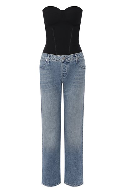 Укороченный комбинезон из коллекции сезона осень-зима стилизован под комплект из корсета и джинсов. Достичь такого эффекта им помогли как характерные силуэты, так и разные фактуры и оттенки. Для создания уплотненного лифа использовали черный нейлон с микроузором, а противопоставили ему голубой деним с декоративными потертостями, которые выглядят естественно.