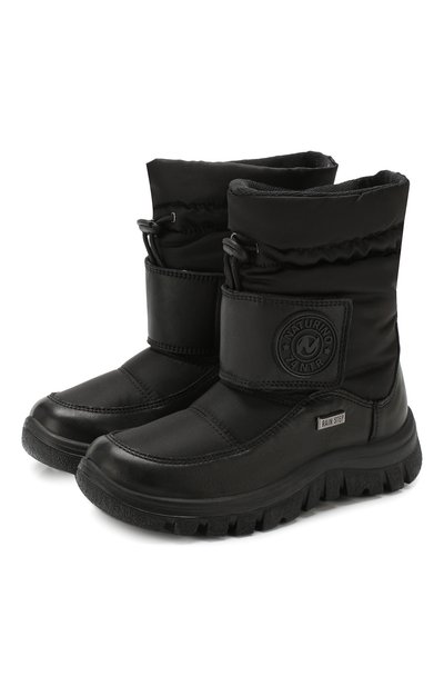 Черные сапоги на широкой подошве с глубоким противоскользящим протектором — идеальный выбор для прогулок даже в первые морозы. За комфортную для ног температуру отвечают не только не продуваемый нейлон, из которого сшита пара, но и подкладка из мягкой шерсти. Модель усилена вставками из гладкой матовой кожи. Посадка регулируется широким ремешком-велькро и шнурком, продетым в кулиску на голенище.