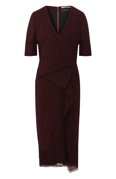 В осенне-зимней коллекции Ролан Муре доказал, что шерстяное букле подходит не только для создания жакетов и костюмов. Такую фактурную ткань дизайнер выбрал для изготовления приталенного платья с V-образным вырезом. Модель с короткими рукавами декорировали объемной драпировкой и ровной бахромой по краям.