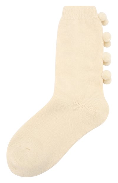 Для изготовления высоких носков кремового оттенка мастера марки использовали мягкую пряжу на базе теплой шерсти. Широкая мягкая резинка надежно удерживает аксессуар на ноге, не впиваясь в кожу. Разнообразие в лаконичный вид модели внесли восемь объемных помпонов в тон.