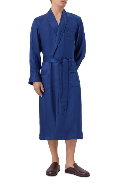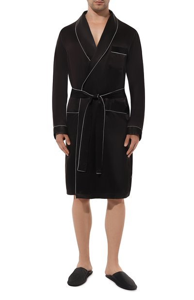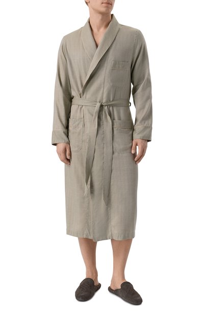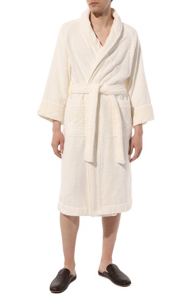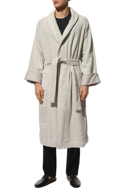 Для пошива халата из коллекции Luxury Jacquard использовали хлопок с жаккардовым узором. Модель с шалевым воротником, двумя накладными карманами и поясом-лентой украшена узким атласным кантом.