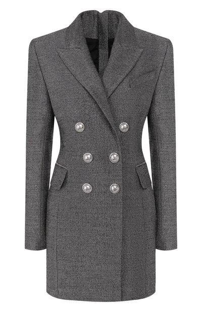 Темно-серое платье из коллекции сезона осень-зима стилизовано под жакет, ставший знаковым для бренда, основанного Пьером Бальманом. Это читается в акцентированной линии плеч и крупных пуговицах с выгравированной эмблемой марки. А фактуру характерного для вещи буклированного материала имитировали с помощью вплетения тонких металлизированных нитей.