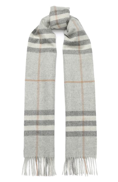 Светло-серый шарф в крупную узнаваемую клетку выполнили из нежного кашемира. Чтобы придать материалу особенную мягкость, пряжу промывают в чистой горной реке, а готовое полотно вычесывают натуральными ворсовальными шишками из засушенных соцветий шотландских растений. Модель декорировали длинной бахромой по краям.