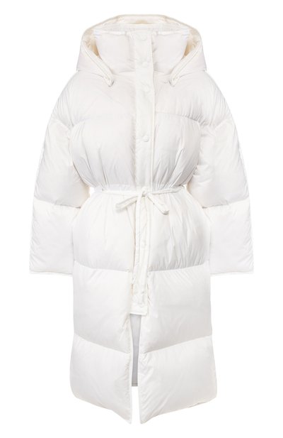 В осенне-зимнюю коллекцию вошла белая куртка. Для пошива модели со съемным капюшоном и с высоким воротником мастера марки использовали гладкий прочный нейлон. Изделие утеплено легким отборным пухом с добавлением пера и простегано горизонтальными строчками, поэтому наполнитель греет равномерно. Узкий однотонный пояс поможет приталить вещь.