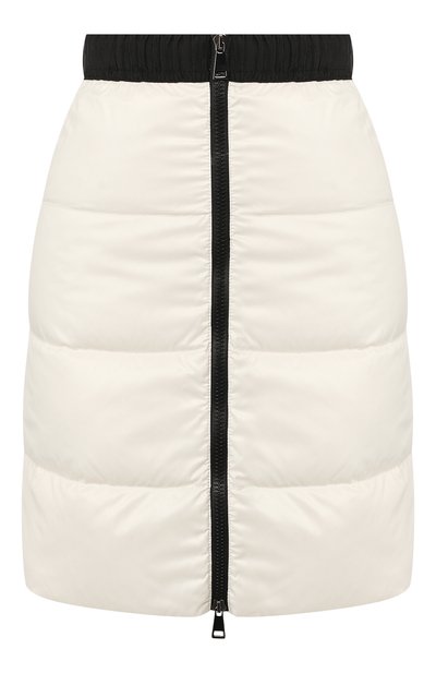 Белая мини-юбка из осенне-зимней коллекции словно создана для долгих прогулок по городу. Модель утеплили гусиным пухом, поэтому в ней будет комфортно в прохладную погоду. Чтобы наполнитель не свалялся со временем, изделие из тонкого глянцевого нейлона простегали горизонтальными строчками. На светлом фоне особенно контрастно выделяются черный эластичный пояс и молния спереди.
