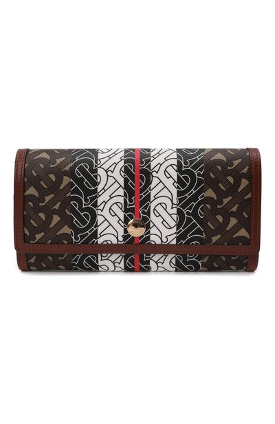 В коричневом кошельке из прочного материала e-canvas объединили знаковые коды бренда, которым придали новое звучание. Полосатый мотив выполнили в цветах клетки, придуманную Томасом Берберри в 1924, а на фоне рисунка расположили эмблему марки. Внутри – 12 слотов для пластиковых карт и карман на молнии (в нем удобно хранить монеты).