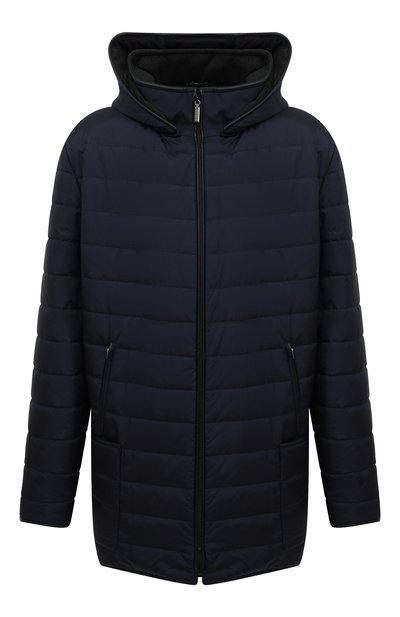 В темно-синем пуховике со съемным капюшоном дизайнеры марки предусмотрели все для приятной прогулки в ненастный день. Особенно прочная шелковая ткань с деликатным блеском не продувается ветром, а слой отборного гусиного пуха, равномерно распределенный по горизонтальным камерам, сохраняет оптимальный микроклимат внутри. Дополнительно ощущение неповторимого комфорта создали нежнейшей кашемировой подкладкой.