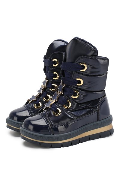 Синие высокие ботинки произвели из знакового материала Biometex: его шелковистая поверхность не боится влаги и капель грязи, а также хорошо сохраняет тепло (в паре будет комфортно при температуре до -25 градусов). Шнуровку декорировали крупными съемными шармами в виде объемных звезд.