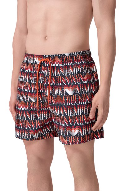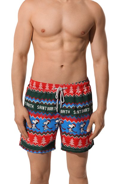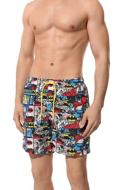 Разноцветные плавки-шорты длиной на несколько сантиметров выше колена сшили из быстросохнущего переработанного полиэстера с принтом в виде персонажей аркады Pac-Man. Изделие с персиковым финишем и белыми контрастными швами дополнили сетчатой подкладкой и тремя карманами. Пояс-кулиску сзади украсили нашивкой с логотипом марки.