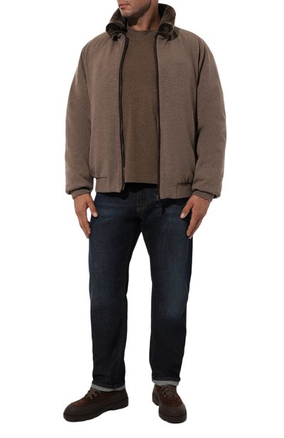 Кашемировый кардиган связали английской резинкой, подчеркнув рифленый узор пряжей двух контрастных оттенков. Модель с высоким воротом и рукавами реглан застегивается молнией с пуллерами, украшенными эмблемой Solomeo.