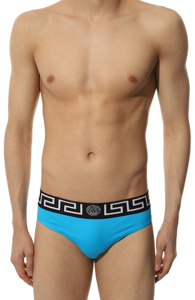 Темно-синие плавки не слетят при сильной волне. Широкий эластичный пояс, который выделили знаковым меандровым узором и изображением головы горгоны Медузы, плотно облегает фигуру, не впиваясь в тело. За комфорт отвечает и мат ериал: шелковистый прочный текстиль быстро сохнет и не вызывает раздражения.
