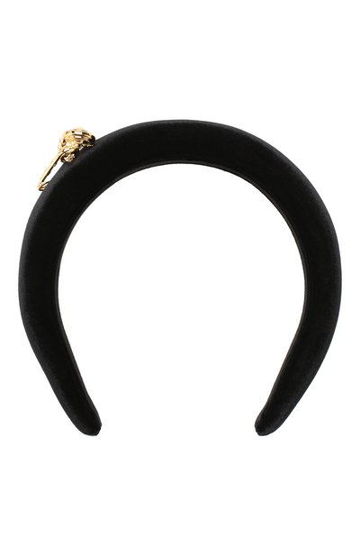 Добавить акцент повседневному комплекту можно одними только аксессуарами: например, этим широким ободком. При создании модели мастера бренда обтянули жесткий каркас черным бархатистым текстилем, а в качестве декора использовали две позолоченные булавки, которые стали знаковыми для марки. Похожие элементы Джанни Версаче впервые использовал в 1994 году.