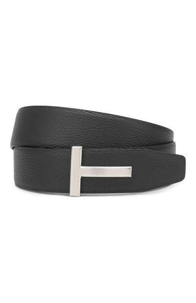Градус формальности этого черного ремня снизили за счет крупной фигурной пряжки в виде знаковой для изделий марки литеры T из полированного металла. Лаконичный аксессуар изготовили из мягкой зернистой кожи с легким блеском.