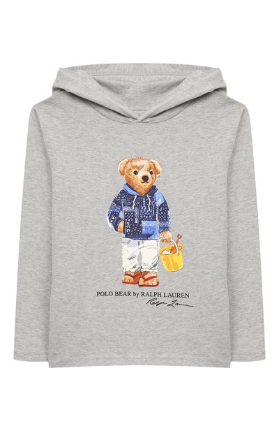 Знакового для бренда персонажа, одетого в вещи марки, Ральф Лорен придумал в 1990-х. Например, этот серый меланжевый лонгслив декорировали крупным принтом Beach Bear. Для создания модели с капюшоном, как у худи, использовали мягкое хлопковое джерси, которое не раздражает кожу и хорошо пропускает воздух.