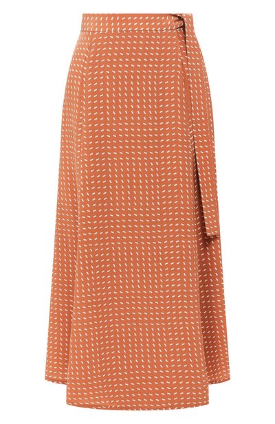 В весенне-летнюю коллекцию вошла слегка расклешенная миди-юбка карамельного оттенка. Для создания модели мастера марки, основанной Пьетро Лоро Пьяна, использовали тонкий струящийся шелк с мелким геометрическим принтом. Широкий пояс дополнили длинными лентами, завязанными объемным бантом. Заданное настроение поддержат рубашка и мюли на шпильке.