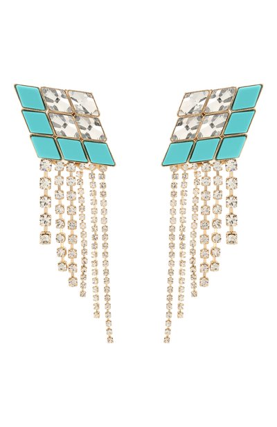 При создании модели Антон Хьюнис нашел способ как сделать серьги-подвески эффектнее. Изделие выполнили из ювелирного сплава, а крупное ромбовидное основание сложили из бирюзовых деталей и прозрачных кристаллов Swarovski. Аксессуар дополнили каскадом из цепочек, также инкрустированных кристаллами.