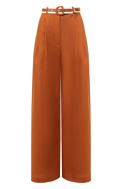 Предлагаем включить в свой репертуар коричневые расклешенные брюки из тонкого прочного льна. Такая вещь будто создана чтоб ы наслаждаться морским бризом, а прописаться в городе ей помогут топ, блейзер и босоножки на высокой шпильке. Ники Циммерманн дополнила модель из круизной коллекции защипами на талии и широким регулируемым ремнем с белым кантом.