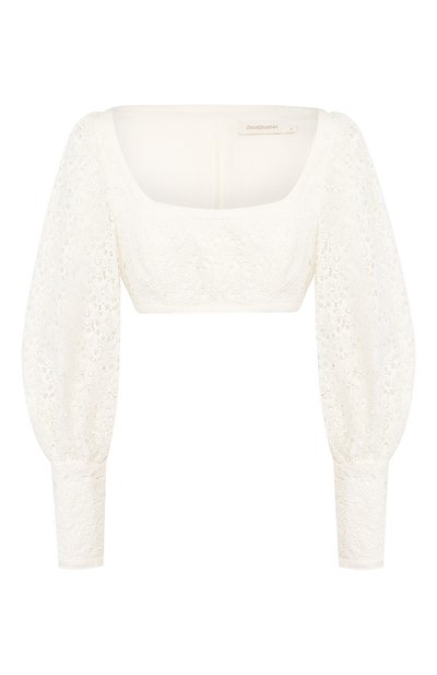 Белый кроп-топ вошел в круизную коллекцию. Ники Циммерманн выбрала для пошива модели с пышными рукавами в викторианском стиле полупрозрачное фактурное кружево с цветочным мотивом. Изделие с глубоким квадратным вырезом на показе сочетали с брюками и шляпой из такого же материала и плетеной обувью, наши стилисты предлагают дополнить образ мини-шортами и мюлями.