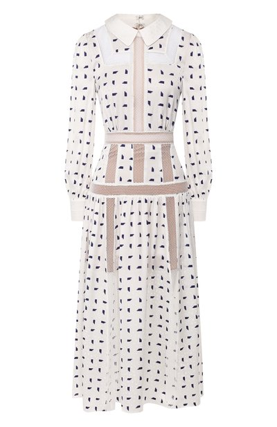 В белом платье с синим узором всего в меру: и женственности, и провокации. За первое отвечает тонкий шелковистый материал на основе вискозы, за второе — сетчатые полупрозрачные вставки, которые также делают изделие более графичным. Модель вошла в весенне-летнюю коллекцию 2020 года.