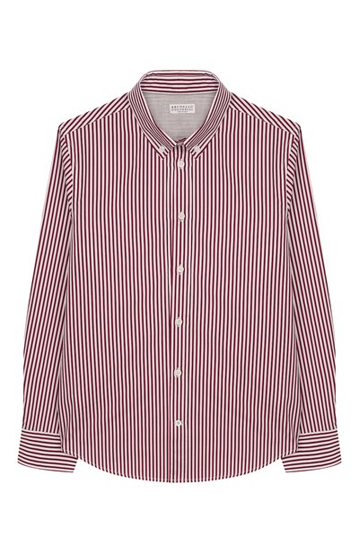 Для создания бордовой полосатой рубашки мастера марки использовали приятный на ощупь гипоаллергенный хлопковый поплин. Изделие из такой ткани хорошо пропускает воздух, быстро отводит лишнюю влагу и поддерживает оптимальную температуру. Свободная модель комфортно садится по фигуре, а благодаря допол нительной пуговице на воротнике button down сохраняет аккуратный вид.