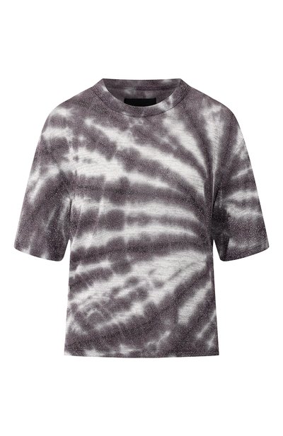 Несмотря на серую гамму и привычный прямой крой футболка из коллекции сезона весна-лето способна стать ярким акцентом в образе: секрет заключается в материале. Для пошива модели использовали нежное джерси с вкраплением люрекса. Изделие уже в готовом виде обесцветили по методу тай-дай: вещь произвольно свернули в узлы и наносили пигменты.