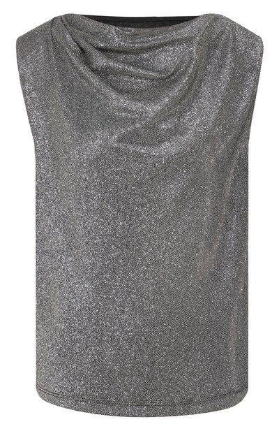 В сочетании с юбкой и босоножками на высокой шпильке топ из весенне-летней коллекции станет частью коктейльного образа. Серебристый цвет и легкое мерцание металлизированных нитей всегда смотрятся выигрышно, а романтичное настроение вещи придают мягкие драпировки.