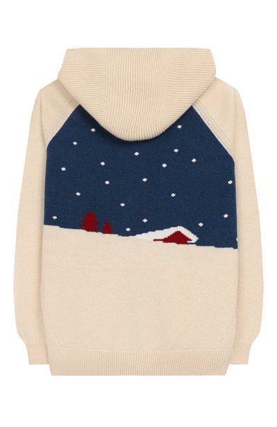 Серый кардиган с рукавами реглан и капюшоном создали из мягкого baby-кашемира. При изготовлении пряжи использовали вычесанный вручную и очищенный от грубого ворса подпушек молочных козлят породы Hircus. Такому материалу нет равных по легкости и теплу, а вещи из него не сковывают движения. На спинке белыми, голубыми и бордовыми нитями сложили альпийский пейзаж, а спереди — изображение двух елок.