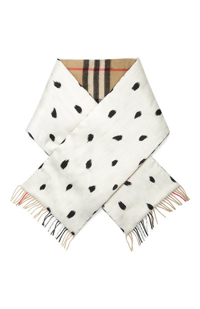 Для создания широкого шарфа мастера марки использовали комбинацию гладкого шелка с анималистичным принтом и нежного кашемира в знаковую клетку Vintage check. Модель утеплили тонкой прослойкой, которая хорошо держит форму и придает аксессуару визуальный объем. Края декорировали длинной бахромой.