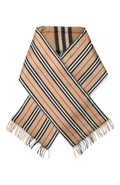Для создания широкого бежевого шарфа мастера марки использовали мягкий нежный кашемир в знаковую клетку Vintage check и гладкий матовый шелк с полосатым мотивом в цветах этого узнаваемого геометрического узора. Модель утеплили легкой прослойкой, которая придает аксессуару визуальный объем и хорошо держит форму. По краям – длинная разноцветная бахрома.