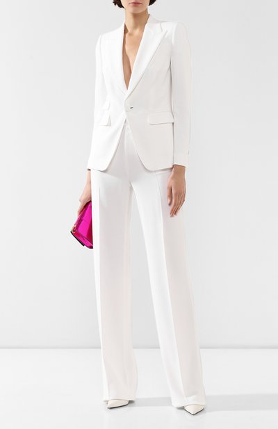 Белоснежный костюм из коллекции сезона весна-лето справится с ролью вечернего платья: остается сочетать его с туфлями в тон и клатчем сочного розового цвета. Однобортный жакет с экстремально глубоким вырезом выполнен из нежной легкой вискозной ткани, в которую добавили эластановые нити для прочности. Из такого же мягкого материала сшиты прямые брюки с комфортной завышенной посадкой.