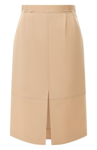 В весенне-летнюю коллекцию Наташа Рамсей-Леви включила прямую бежевую юбку с защипами на поясе. Модель выполнили из фактурного трикотажа: тонкая шерсть в его составе отвечает за мягкость, а благодаря добавлению нейлоновых и эластановых волокон изделие не пилингуется и хорошо держит форму. Спереди – высокий разрез, открывающий ноги в движении.