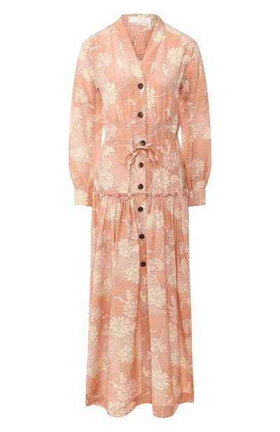 На показе круизной коллекции длинное платье-рубашку оттенка пыльной розы сочетали с ботинками на широкой подошве, а наши стилисты предлагают носить с казаками. Для создания приталенной модели с глубоким V-образным вырезом Наташа Рамсей-Леви выбрала легкий струящийся шелк. Монохромный цветочный принт, объемные рукава и оборка на расклешенном подоле задают изделию романтичное настроение.