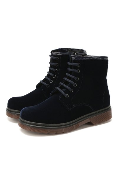 В темно-синих представленных э ксклюзивно в ЦУМе ботинках ноги у ребенка не устанут. Все дело в стельке: ее дополнили мягкой подкладкой так, что она стала повторять анатомическое строение стопы. Для создания модели с молнией и шнуровкой мастера марки использовали прочный бархат.