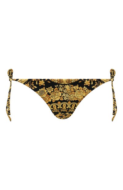 Черные плавки-бикини сшиты из быстросохнущего гладкого джерси со знаковыми для марки барочными принтами. Такой материал не боится соленой воды и хлора, поэтому изделия из него надолго сохраняют свой первоначальный вид. По бокам — узкие ленты, регулирующие посадку на бедрах.