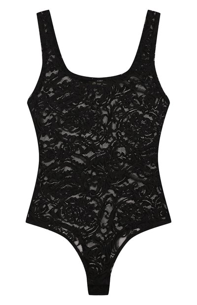 Черное боди с глубокими круглыми вырезами спереди и сзади изготовили из полупрозрачного кружева со знаковым для марки мотивом Barocco. Благодаря эластановым волокнам в составе изделие из такого материала комфортно облегает фигуру, а плоские швы не вызывают раздражения на коже.