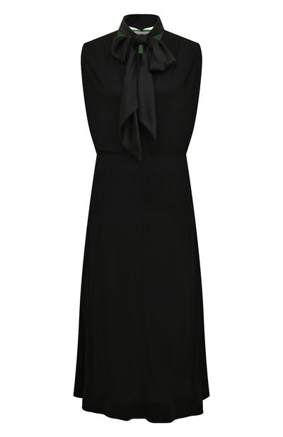 Несмотря на сдержанный черный цвет, приталенное платье из весенне-летней коллекции не выглядит просто. Клэр Уэйт Келлер смягчила строгий характер вещи при помощи широких ярко-зеленых вставок сзади и длинного атласного шарфа, концы которого можно завязать объемным бантом или оставить свободными. Для создания модели мастера марки, основанной Юбером де Живанши, использовали тонкую шелковистую вискозу.
