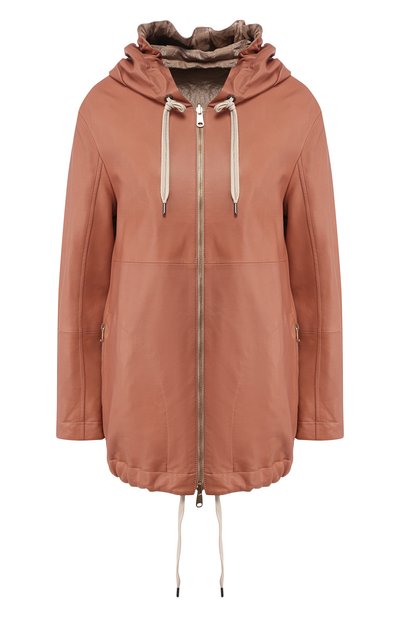 У розовой куртки из весенне-летней коллекции много достоинств, но главное из них — материал. Для пошива двусторонней модели Брунелло Кучинелли выбрал матовую наппу Soft и плотный фактурный трикотин Shiny легким с переливчатым блеском. Плетеный шнур, продетый в кулиске на капюшоне, декорировали цепочкой мониль.