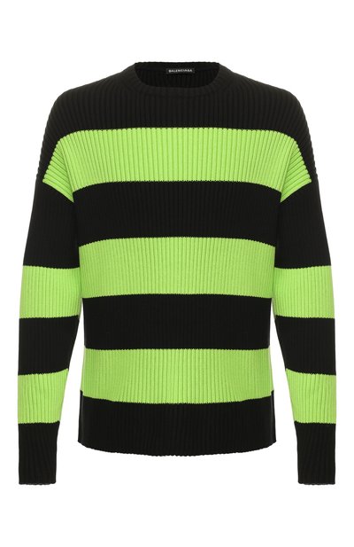 Свитер из весенне-летней коллекции бренда, основанной Кристобалем Баленсиагой, бросается в глаза широким полосатым узором, в котором замиксовали базовый черный и неоново-зеленый оттенки. Модель с гипертрофированно длинными рукавами выполнили из легкой хлопковой пряжи. За счет узора английская резинка изделие тянется и быстро возвращается в первоначальную форму. Сзади белой краской изобразили логотип и архивную эмблему марки.