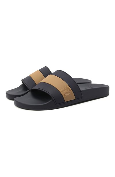 В этих шлепанцах команда бренда, основанного Брунелло Кучинелли, в равной степени уделила внимание и комфорту, и внешнему виду. Гладкий материал не натирает ногу, за счет анатомической стельки стопа находится в правильном положении, а рифленый протектор не дает скользить. Перемычку темно-синей пары выделили бежевой полосой, на которой создали оттиск в виде эмблемы.