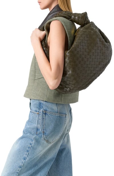 Ручку кожаной сумки Jodie, сплетенной в технике intreccio ad inserto, подчеркнули крупным узлом. Основное отделение и единственный внутренний карман застегиваются молниями. В аксессуар с гладким подкладом из телячьей кожи поместятся планшет и косметичка.