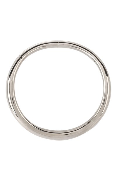 Крупное колье тоже может выглядеть минималистично: серебристая модель — лучшее подтверждение. Форму аксессуара позаимствовали у чокера, но изменили так, чтобы он повторял естественные изгибы шеи. Для создания изделия мастера марки использовали гладкий металл с зеркальным блеском.