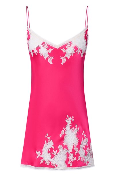 Короткая сорочка с узкими бретелями изготовлена вручную из почти невесомого шелкового сатина насыщенного оттенка фуксии. На таком ярком фоне особенно выразительно выглядят знаковые для бренда вставки из тончайшего белого кружева шантильи с цветочным мотивом. Нежный декор поддерживает ажурный кант с едва заметной бахромой.
