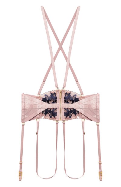 Широкий пояс, словно составленный из атласных эластичных лент, плотно облегает, создавая легкий корректирующий эффект. Модель дополнили длинными бретелями, перекрещивающимися на спине. Изделие декорировали фигурной вставкой из ажурного цветочного кружева ручной работы, а всю фурнитуру традиционно покрыли тонким слоем 24-каратного золота.