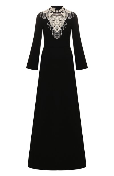 На примере модели из весенне-летней коллекции бренда, основанного Гуччио Гуччи, дизайнер Алессандро Микеле доказал, что полностью закрытое черное платье может выглядеть эффектно. Все дело в одной детали, напоминающей колье. Ее сложили из кремового цветочного кружева, которое сопроводили каскадом из кристального паве и крупной брошью, инкрустированной похожими элементами. В качестве фона выступает плотный матовый текстиль.