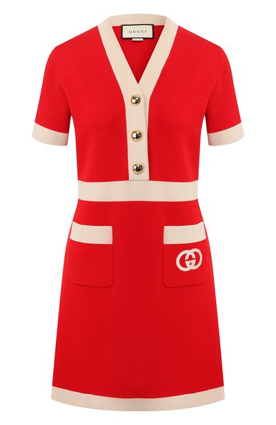 У синего платья из весенне-летней коллекции отчетливый ретро-силуэт. Из-за слабовыраженной талии и слегка расклешенного подола оно напоминает модели из 1960-х. Сходство усиливают крупные пуговицы на лифе, широкие белые полосы, которыми подчеркнули детали, и два крупных накладных кармана спереди. Мастера марки, основанной Гуччио Гуччи, выполнили изделие из мягкого шерстяного текстиля.