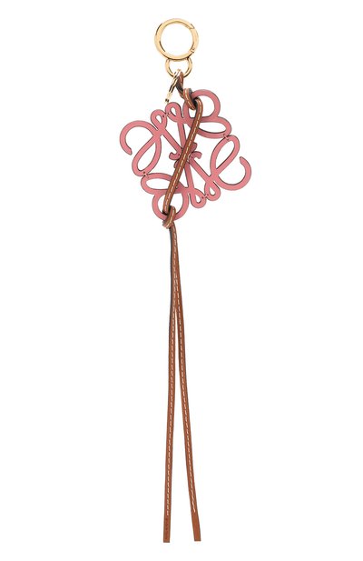 Светло-розовый брелок с витиеватой анаграммой и длинными тонкими лентами выполнен вручную из матовой прочной кожи. Аксессуар с золотистыми разъемными кольцами можно использовать не только для связки ключей, но и украсить им любимую сумку или ремень.
