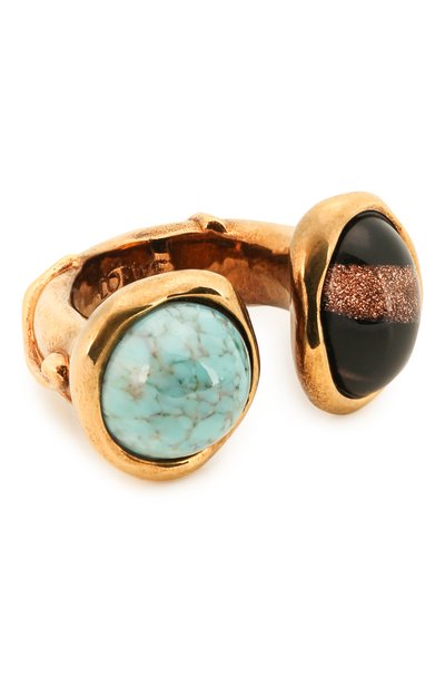 Мастера бренда стилизовали кольцо цвета античной латуни под деревянную деталь, оплетенную лозой Разомкнутую форму изделия подчеркнули крупными полукруглыми камнями, похожими на яшму и бирюзу. Аксессуар, напоминающий «украшение с историей», разнообразит повседневный комплект и поставит нужный акцент в коктейльном наряде.