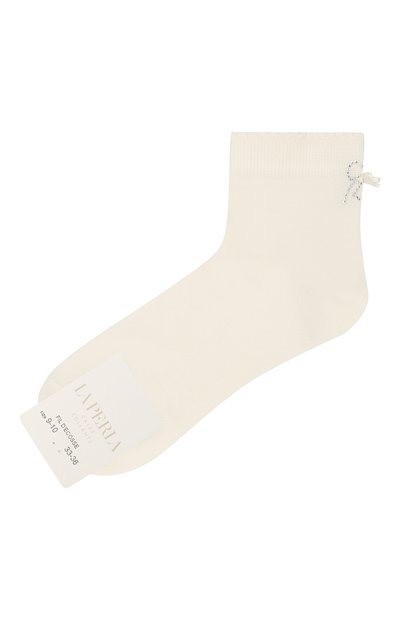 Для создания кремовых носков с миниатюрным бантом мастера марки использовали мягкий тонкий трикотаж. Хлопок в его составе отвечает за эффективную циркуляцию воздуха и испарение влаги, а гладкие нейлоновые волокна защищают белье от деформации после стирок.
