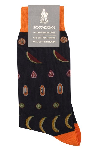 Темно-синие носки с фруктовым паттерном и оранжевыми манжетами добавят образу ироничного настроения. Но главное достоинство высокой модели — материал. Изделие создали на собственной старинной фабрике в Лестере из ультрамягкого тонкого хлопка. Он хорошо пропускает воздух и быстро отводит влагу. Чтобы аксессуар стал прочнее и лучше держал форму, в состав пряжи включили легкий нейлон.