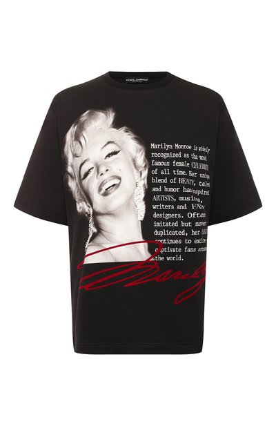 Принт на этой черной футболке из коллекции сезона весна-лето – ода Мэрилин Монро. Для изготовления модели Доменико Дольче и Стефано Габбана выбрали мягкий прочный хлопок. Материал не растягивается и не выцветает даже после многократных стирок, поэтому изделие прослужит долго.